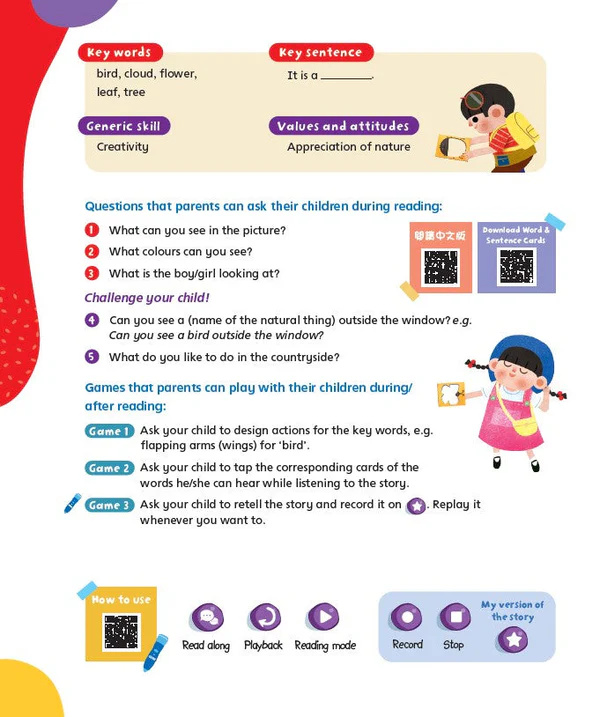 - 雙語家長指引:提供伴讀提問及親子活動建議;